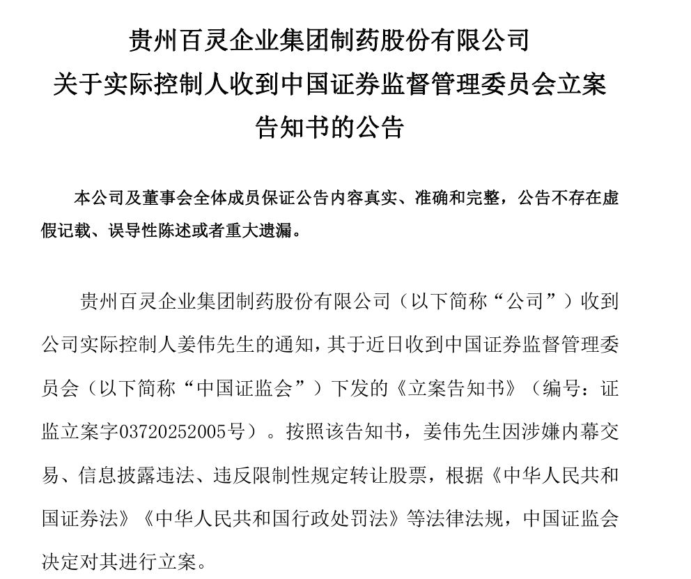 12月3日,贵州百灵(002424.SZ,股价5.57元,市值77.85亿元)公告称,公司实际控制人姜伟近日收到中国证监会立案告知书,因涉嫌内幕交易、信息披露违法、违反限制性规定转让股票,中国证监会决定对其进行立案。本次立案系对姜伟个人的调查,与公司日常经营无关,不会影响上市公司及子公司生产经营。姜伟将配合证监会的调查工作,公司将持续关注进展并及时履行信息披露义务。