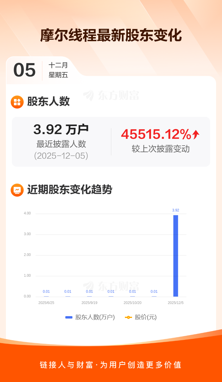 摩尔线程最新披露数据显示,截至12月5日公司股东户数为3.92万户,较上期(2025年11月14日)增加3.91万户,增幅为45515.12%。户均持有流通股数量由上期的null股上升至748股,户均持股金额为null元。