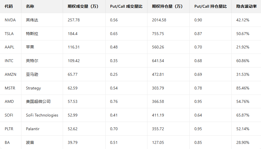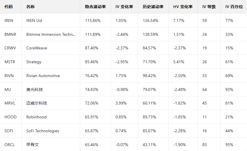 美股期权波动率排行榜前十(标的市值>100亿美元,且期权成交量>10万张)