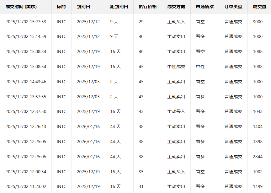 2、英特尔上一交易日涨8.65%,7个交易日股价飙升近30%,前一日认沽/认购比例下行,成交量上行。