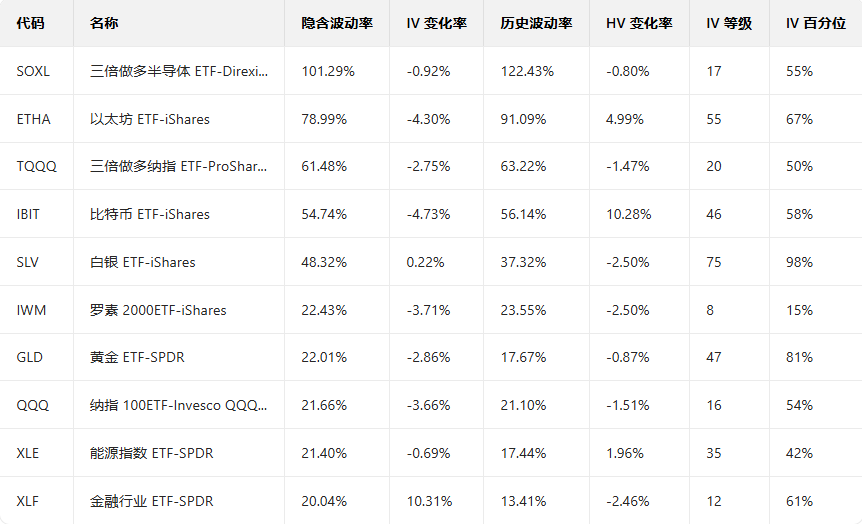 美股ETF引申波幅排行榜前十(标的要求:市值>100亿美元)