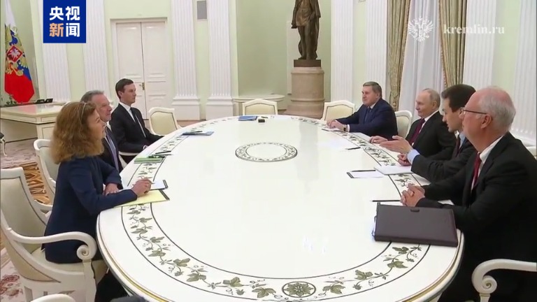 当地时间12月2日晚,俄总统普京在克里姆林宫会晤美特使威特科夫和特朗普女婿库什纳。(图片来源:央视新闻)