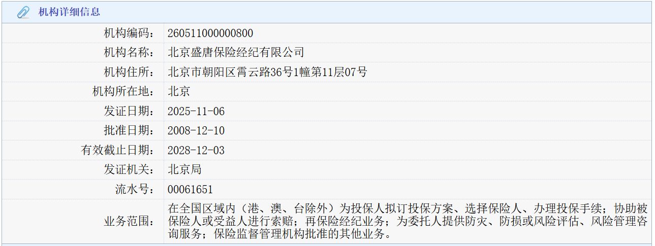 记者注意到,尽管公司名称已更改,其官网域名仍与“盛唐保险”的拼音字母相关。此外,官网披露的保险中介许可证中机构名称仍为“北京盛唐保险经纪有限公司”,发证机关为国家金融监督管理总局北京监管局,落款时间以及国家金融监督管理总局官网披露的该公司发证日期均为2025年11月6日。