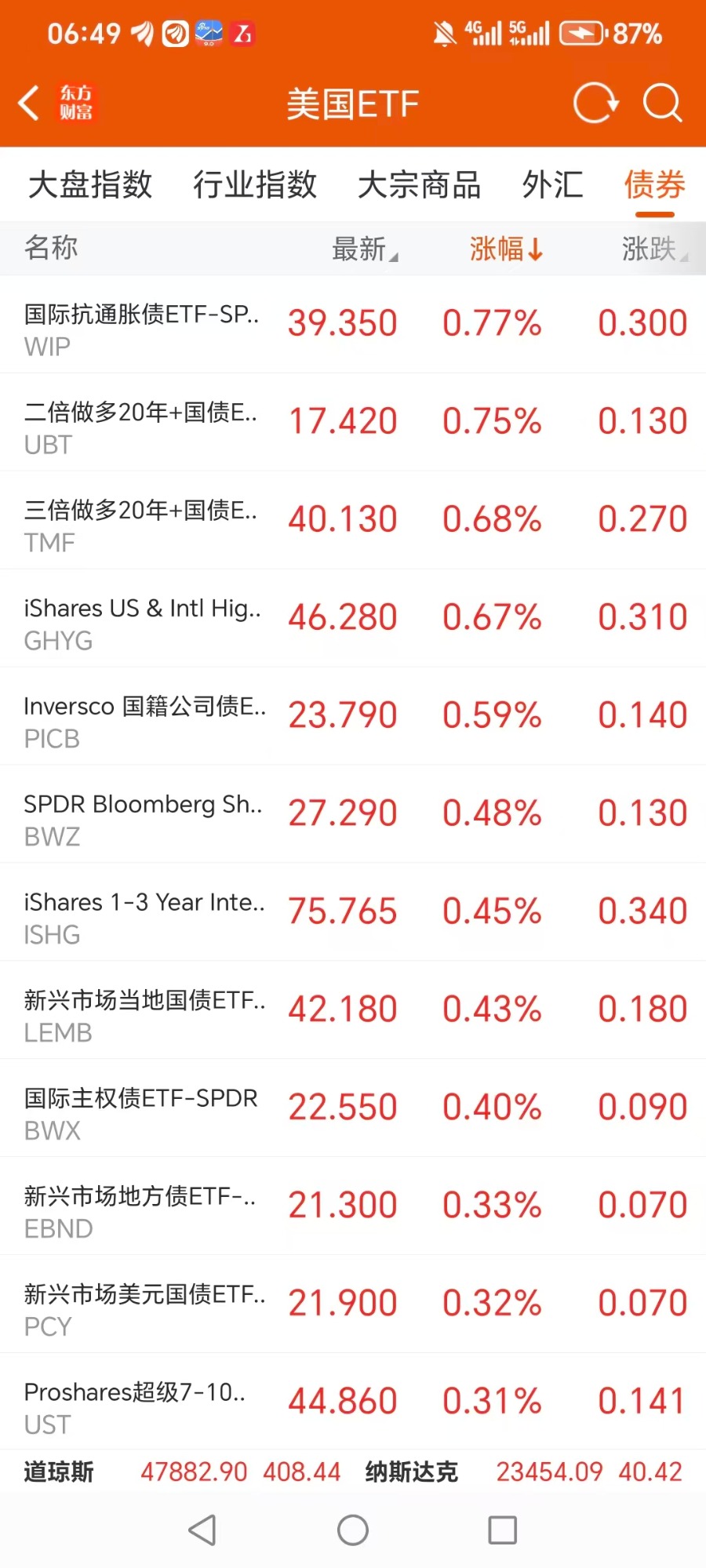 三倍做多20年期以上国债ETF-Direxion (TMF.US) 升0.70%,成交额2.29亿美元。