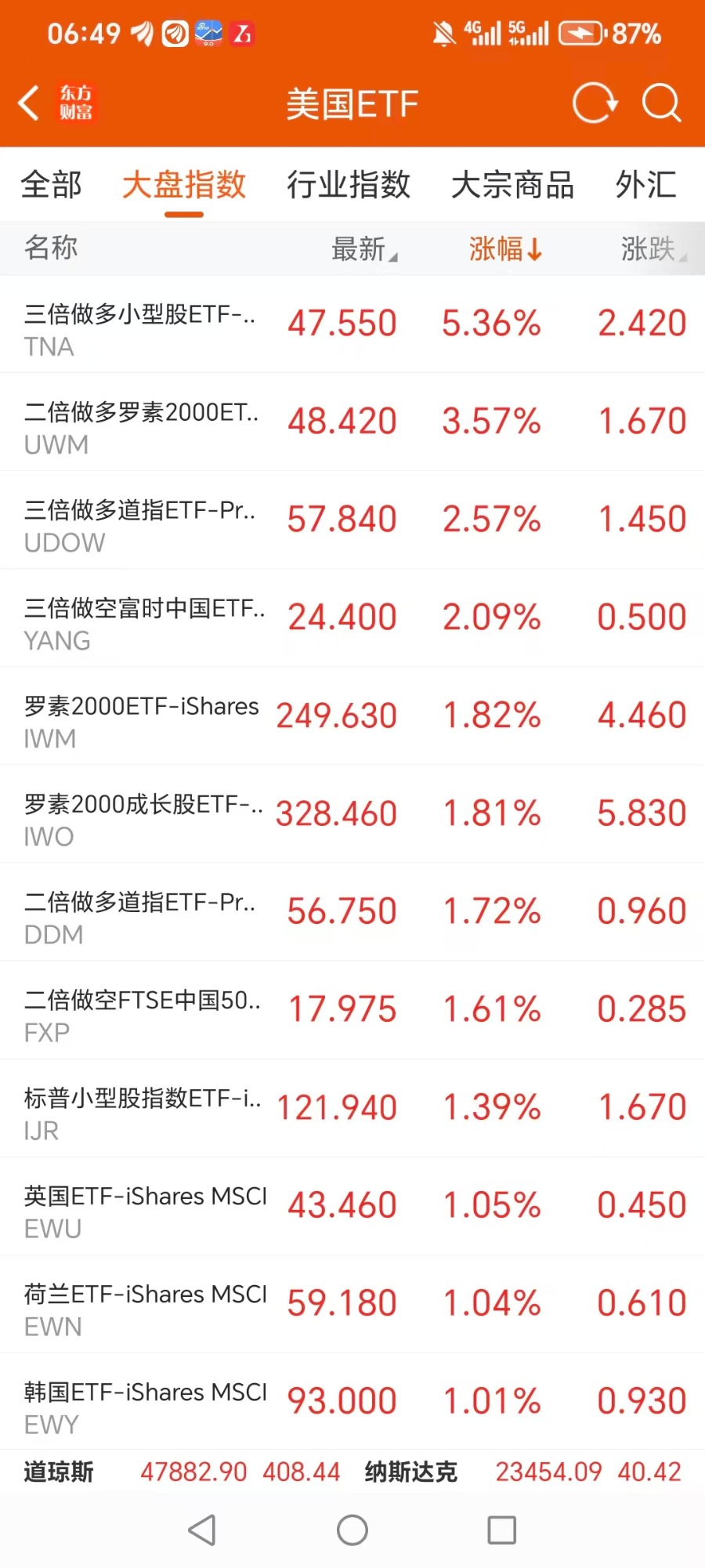 三倍做多小盘股ETF-Direxion (TNA.US) 升5.34%,成交额4.88亿美元。
