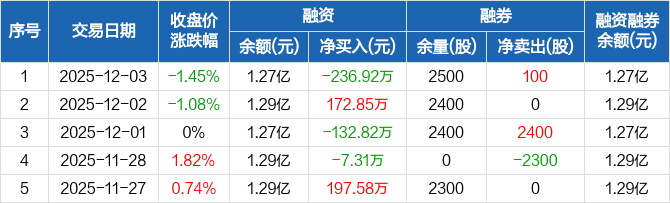 融资方面,当日融资买入206.47万元,融资偿还443.39万元,融资净偿还236.92万元。融券方面,融券卖出100股,融券偿还0股,融券余量2500股,融券余额6800元。融资融券余额合计1.27亿元。