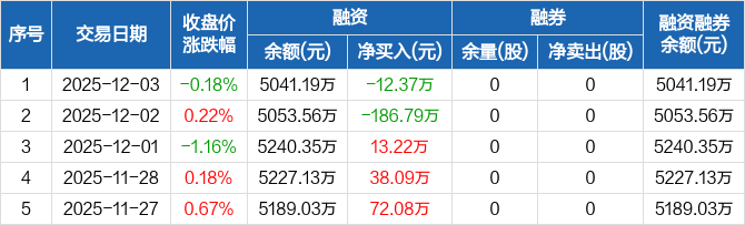 艾隆科技:融资余额5041.19万元,创近一年新低(12-03)