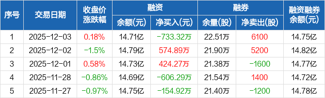 融资方面,当日融资买入1211.89万元,融资偿还1945.21万元,融资净偿还733.32万元。融券方面,融券卖出1.35万股,融券偿还7400股,融券余量22.51万股,融券余额386.32万元。融资融券余额合计14.75亿元。