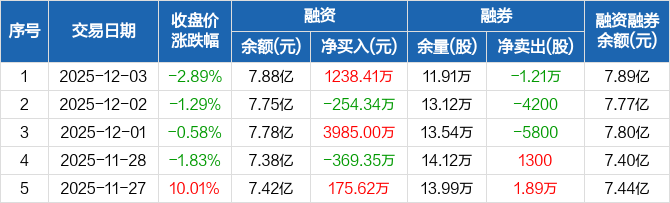融资方面,当日融资买入8027.17万元,融资偿还6788.76万元,融资净买入1238.41万元。融券方面,融券卖出1.03万股,融券偿还2.24万股,融券余量11.91万股,融券余额176.39万元。融资融券余额合计7.89亿元。