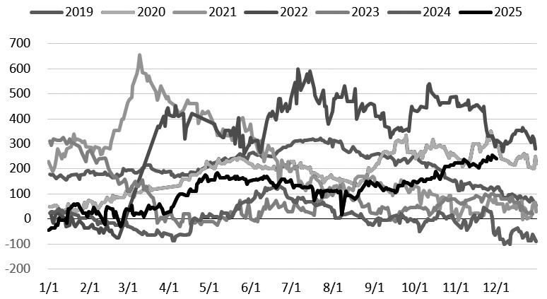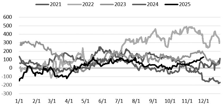 截至12月1日,印度港口毛豆油与毛棕榈油价差扩大至130美元/吨,高于2024年同期的-145美元/吨;毛葵油与毛棕榈油价差扩大至240美元/吨,高于2024年同期的-35美元/吨。对印度而言,棕榈油具有性价比。贸易商估计,11月印度棕榈油进口量环比增长4.6%,至63万吨,低于2024年同期的84万吨;12月进口量可能进一步上升至80万吨,高于2024年同期的50万吨。目前,南美豆油出口高峰期已过,且巴西将于2026年3月执行B16生物柴油政策,黑海地区葵油增产幅度不及预期,价格维持高位,因此,在印度2026年斋月前,棕榈油仍然具有价格优势。