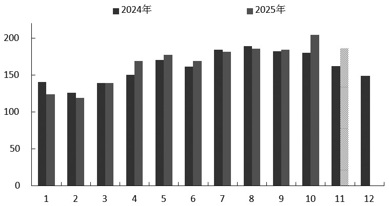上半年,机构预估今年马来西亚棕榈油产量为1950万吨,略高于2024年的1934万吨。然而,从6月开始,马来西亚棕榈油产量持续维持较高增速,进入减产周期的10月也保持增长,市场预估今年马来西亚棕榈油产量有望突破2000万吨。另外,马来西亚棕榈油局(MPOB)10月报告显示,马来西亚棕榈油累库超预期。进入11月,马来西亚棕榈油出口降幅不断扩大,印度和中国等国采购放缓。印尼能矿部公布的数据显示,截至11月初,年内印尼生物柴油累计分销量为122.5亿升,而2025年全年目标为156亿升,如果保持当前分销速度,全年目标将难以完成。