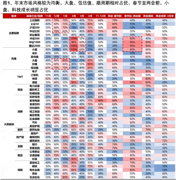12月至次年1月,市场风格较为均衡,大盘、低估值、顺周期风格相对占优。而随着春节临近,直到两会前,是一段典型的由流动性和风险偏好驱动的躁动窗口,市场风格也转为小盘、科技成长明显占优。