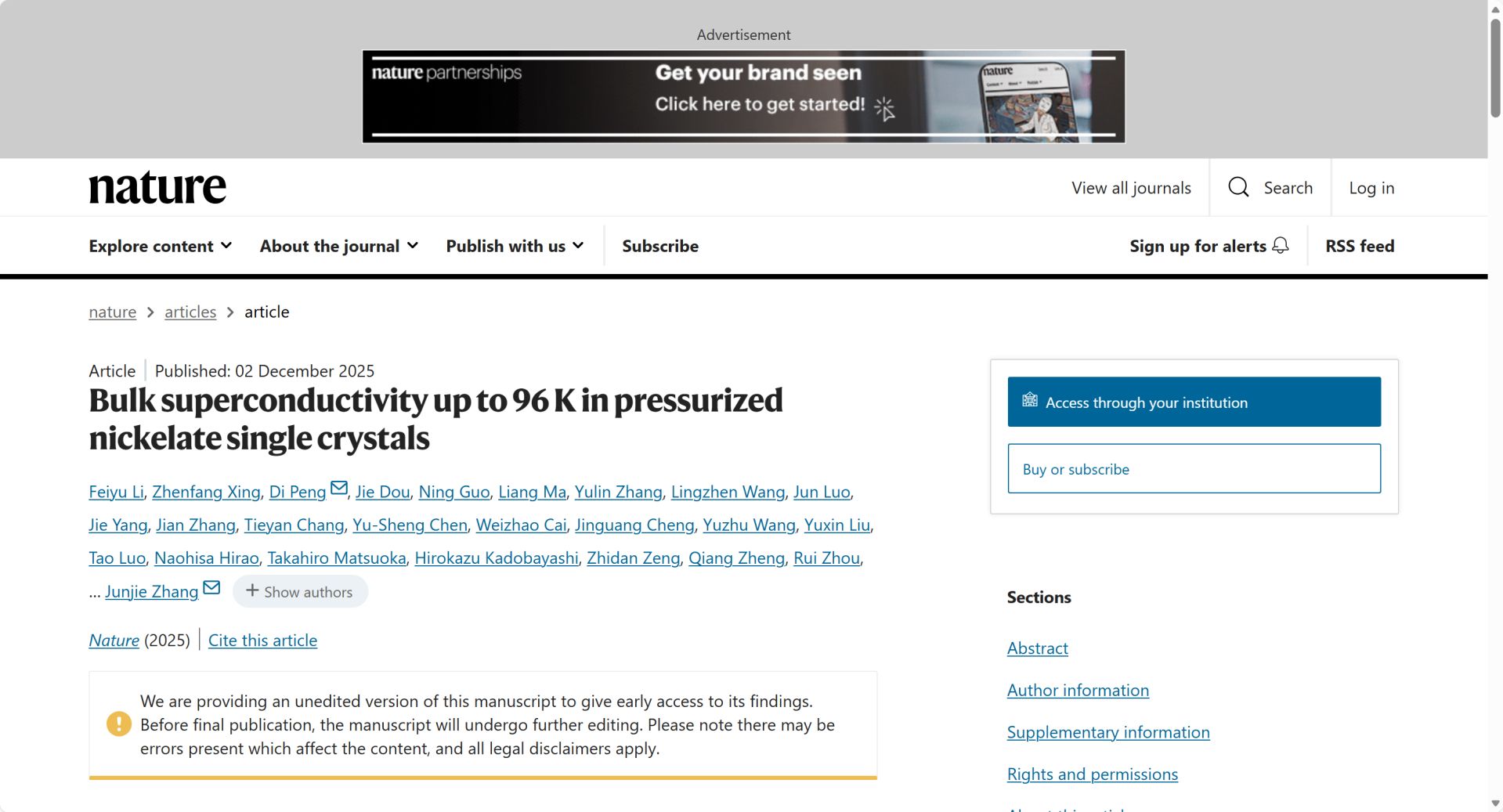 据山东大学官方微信号12月3日消息,近日,山东大学晶体材料全国重点实验室张俊杰教授/陶绪堂教授团队牵头,联合北京高压研究中心曾桥石研究员、中国科学院物理研究所周睿研究员、国家纳米科学中心郑强研究员、芝加哥大学陈愈生教授等多个团队,在镍基高温超导体研究中取得重大突破,相关团队以“Bulk superconductivity up to 96 K in pressurized nickelate single crystals”为题,在线发表于国际顶级期刊《自然》(Nature)上。