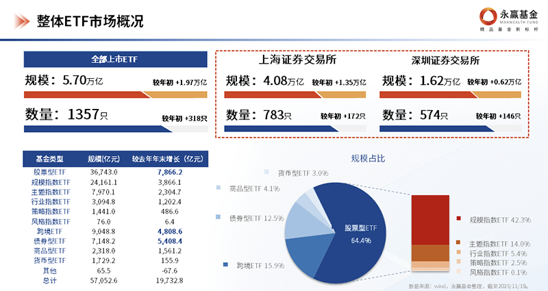 2025年,中国ETF市场实现了跨越式发展。截至11月中旬,全市场已上市ETF总规模突破5.7万亿元,较年初增长近2万亿元。①在市场规模显著扩容的同时,ETF作为资产配置工具的价值日益凸显,年内多类型ETF均为投资者带来不错收益。