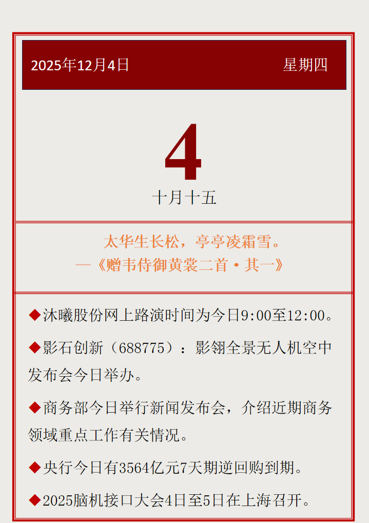 【投资日历】周四(12月4日)资本市场大事