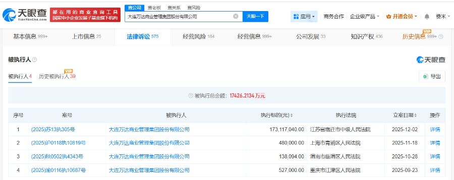 12月4日,21财经·南财快讯记者注意到,天眼查法律诉讼信息显示,近日,大连万达商业管理集团股份有限公司、宿迁万达广场投资有限公司新增一则被执行人信息,执行标的1.7亿余元,执行法院为江苏省宿迁市中级人民法院。