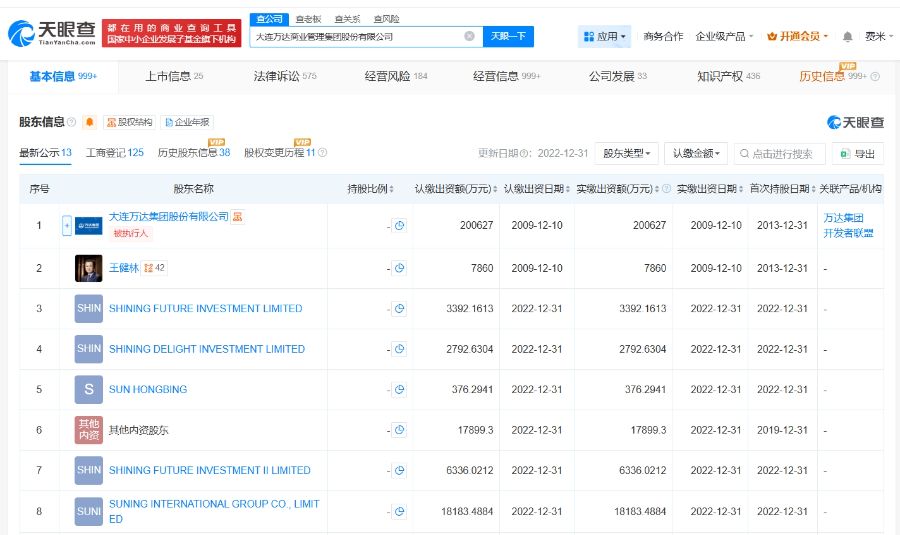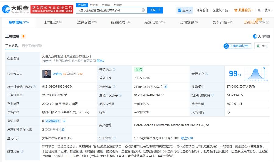 大连万达商业管理集团股份有限公司成立于2002年9月,法定代表人为张春远,注册资本约271.6亿人民币,由大连万达集团股份有限公司、王健林等13位股东共同持股;公司主营业务包括为全国各地的万达广场提供商业管理服务。天眼风险信息显示,该公司现存多条被执行人、股权冻结信息。
