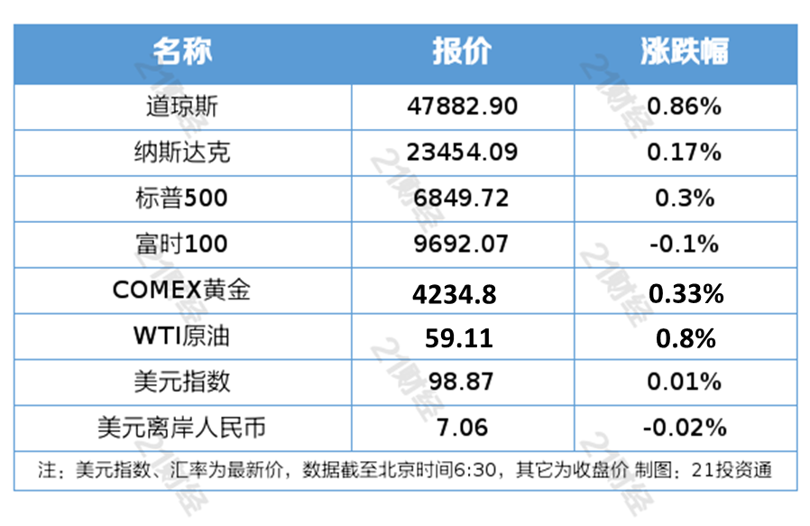 1、美国三大股指小幅收涨,道指涨0.86%报47882.9点,标普500指数涨0.3%报6849.72点,纳指涨0.17%报23454.09点。联合健康集团涨超4%,高盛集团涨逾2%,领涨道指。万得美国科技七巨头指数跌0.43%,微软跌超2%,英伟达跌逾1%。中概股多数下跌,阿特斯太阳能跌超9%,蔚来跌近5%。最新ADP就业数据显示劳动力市场萎缩,使投资者增大了对美联储将于下周降息的押注。
