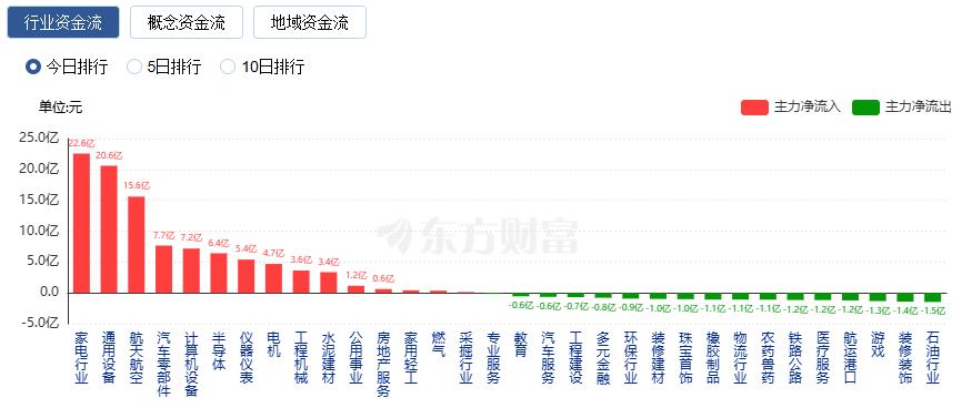 行业资金方面,截至收盘,家电行业、通用设备、航天航空等净流入排名靠前,其中家电行业净流入22.58亿。