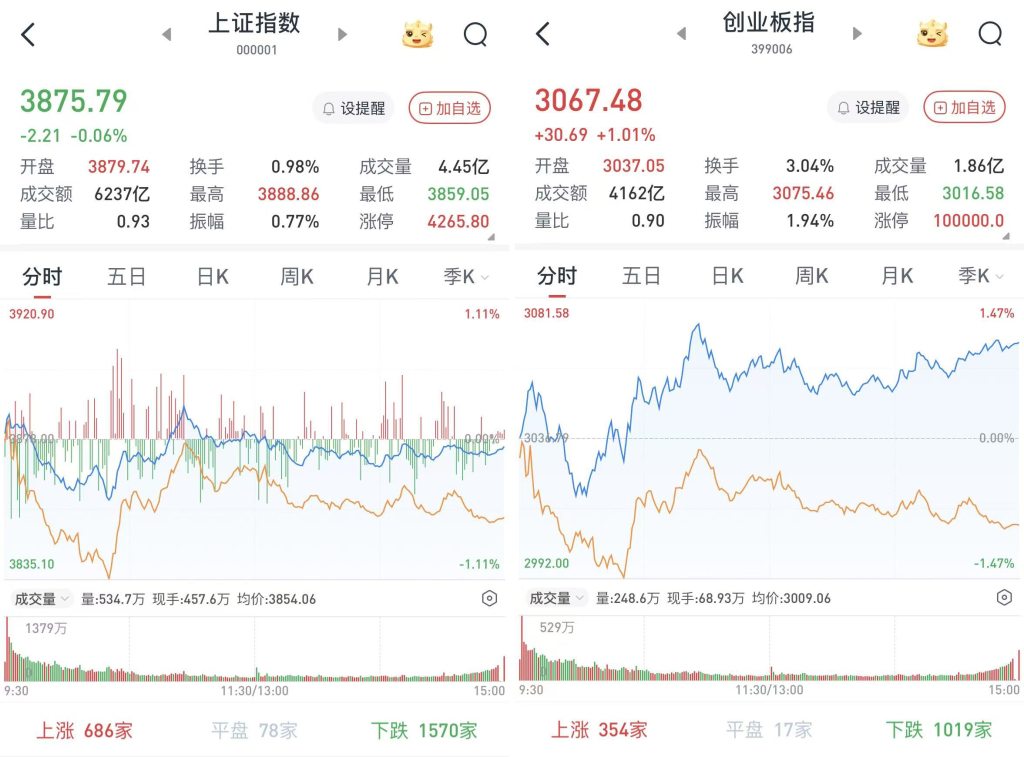 至收盘,上证综指跌0.06%,报3875.79点;科创50指数涨1.36%,报1326.16点;深证成指涨0.4%,报13006.72点;创业板指涨1.01%,报3067.48点。