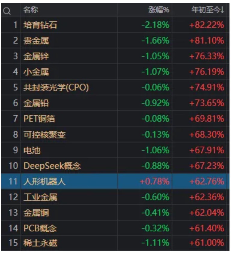 而人形机器人板块虽然今天整体涨幅不算大,但板块内涨停个股却不少,因此可以说受到短线资金关注。并且在年内涨幅靠前的板块里,人形机器人也是唯一飘红的。