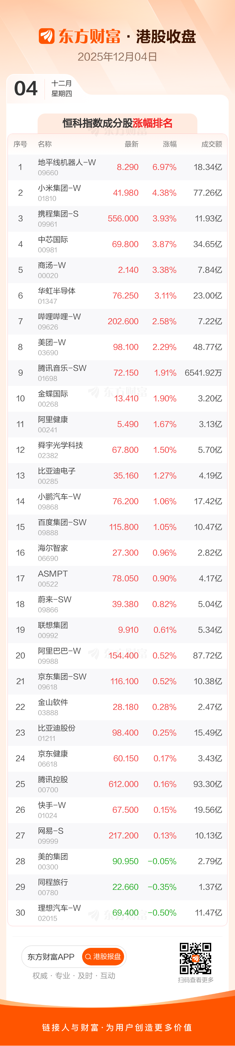 12月4日港股收盘:恒指涨0.68% 科技指数涨1.45%