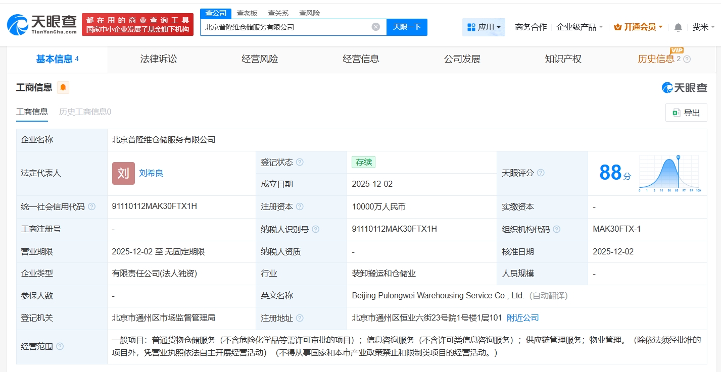 南方财经12月4日电,天眼查工商信息显示,近日,北京普隆维仓储服务有限公司成立,法定代表人为刘希良,注册资本1亿人民币,经营范围为普通货物仓储服务、信息咨询服务、供应链管理服务、物业管理。股东信息显示,该公司由普洛斯投资(上海)有限公司全资持股。