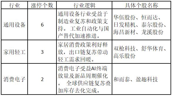 从行业特征来看,今日涨停板个股中,通用设备、家用轻工、消费电子行业的个股最多。