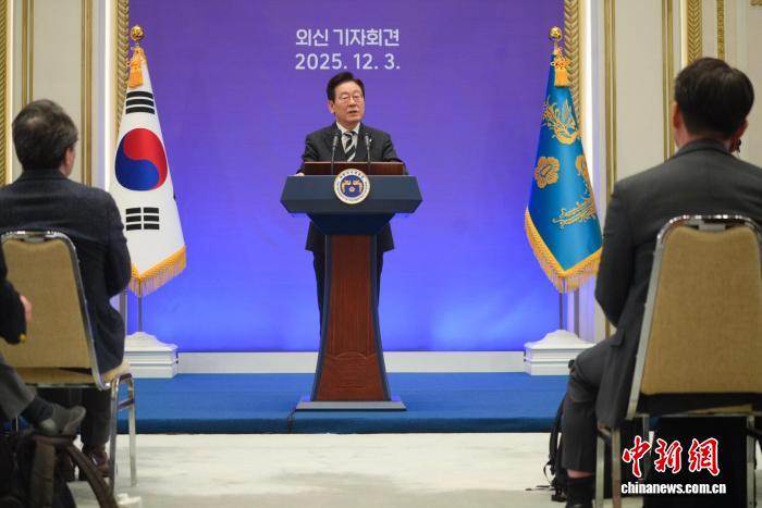 当地时间12月3日,韩国总统李在明在青瓦台迎宾馆举行外媒记者会。中新社记者刘旭摄