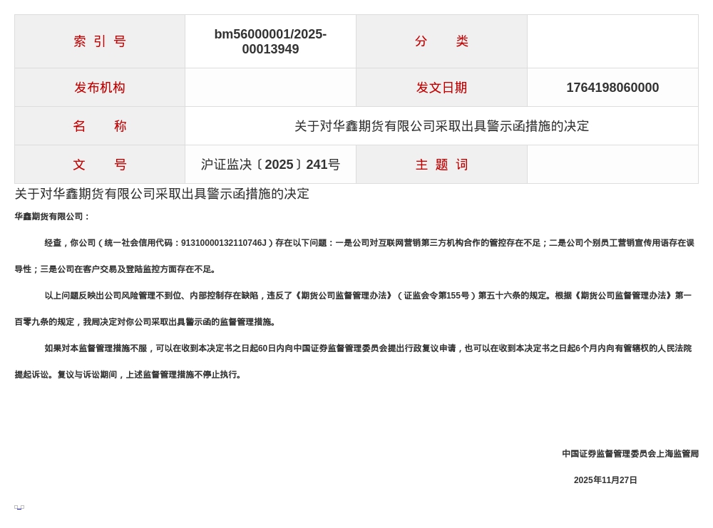 因此,中国证券监督管理委员会上海监管局决定对华鑫期货采取出具警示函的监督管理措施。