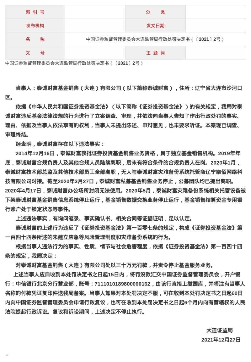 蓝鲸新闻12月3日讯,近日,大连证监局发布了行政处罚决定书,剑指泰诚财富基金销售(大连)有限公司。