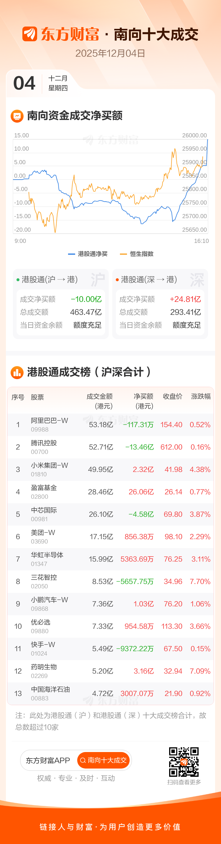 12月4日南向资金净买逾14亿港元,逾26亿抢筹盈富基金