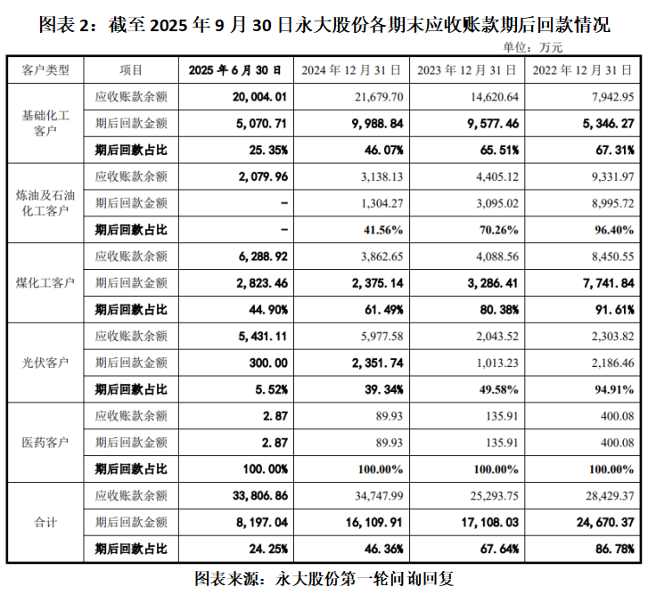 在第一轮问询回复文件中,永大股份表示,公司下游客户主要为基础化工、炼油及石油化工、煤化工与光伏领域的大型企业集团,行业地位突出,处于强势地位,下游客户基于项目执行进度安排资金结算,且结算审批周期较长,进而导致款项回款较慢、应收账款出现一定逾期的情形。
