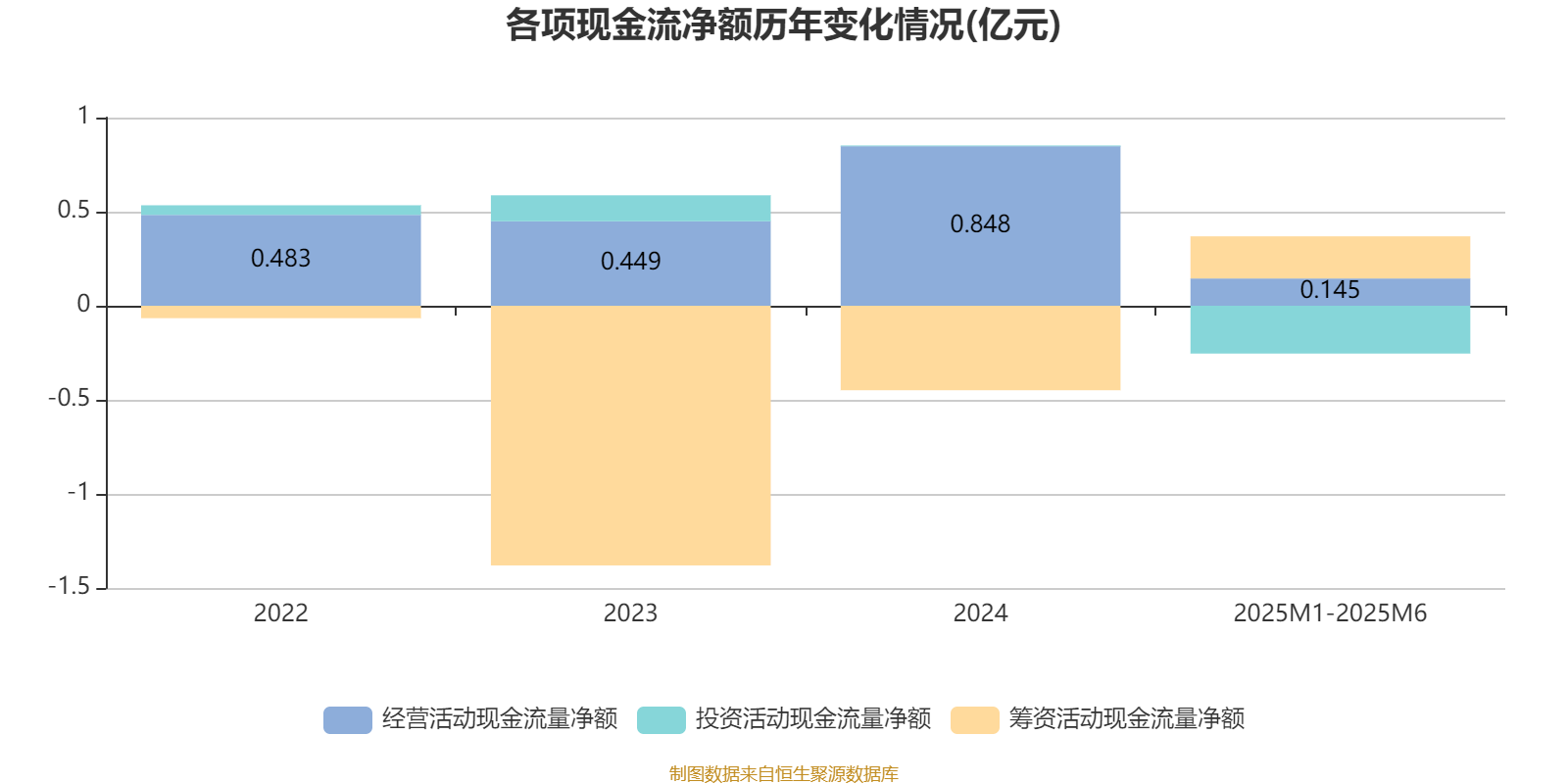2025年1月至6月,公司经营活动现金流净额为1448.8万元,同比下降18.1%;筹资活动现金流净额2243.4万元,同比增加3527.8万元;投资活动现金流净额-2541.9万元,上年同期为249.7万元。