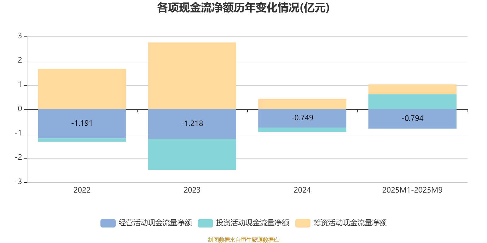2025年1月至9月,公司经营活动现金流净额为-7944.1万元,同比减少2443.4万元;筹资活动现金流净额4024.2万元,同比增加388.5万元;投资活动现金流净额6226万元,上年同期为-4584.9万元。