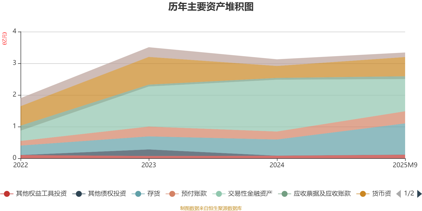 资产重大变化方面,截至2025年9月,公司交易性金融资产较上期末减少37.8%,占公司总资产比重下降21.91个百分点;存货较上期末增加93.78%,占公司总资产比重上升13.3个百分点;货币资金较上期末增加60.83%,占公司总资产比重上升6.08个百分点;预付账款较上期末增加52.37%,占公司总资产比重上升3.43个百分点。
