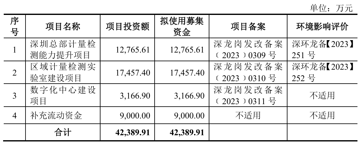 据招股书,本次募资投向中,“深圳总部计量检测能力提升项目”有利于公司提升原有产品市场覆盖广度和深度,从而进一步提升盈利水平;“区域计量检测实验室建设项目”有利于公司为客户提供高效的服务,深耕区域市场业务活动,提升企业经营效益和品牌影响力;“数字化中心建设项目”有利于公司优化业务流程,提升公司运营效率,提升公司市场反应速度并构建全流程、全方位的综合服务体系;通过补充主营业务相关的营运资金,有利于缓解公司营运资金压力,夯实公司发展基础,为后续发展提供充足的资本保证。本次募集资金投资项目的实施,有助于提升公司自主创新能力,增强综合竞争能力,进一步扩大业务规模、提升盈利能力。募集资金使用规划合理,融资具有必要性。