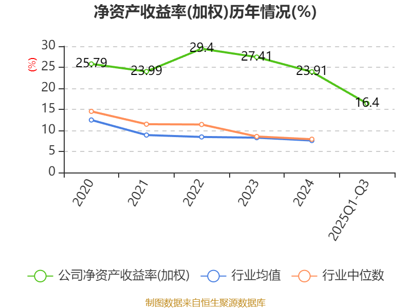 数据显示,2024年公司加权平均净资产收益率为23.91%,较上年同期下降3.5个百分点。2025年前三季度公司加权平均净资产收益率为16.4%。