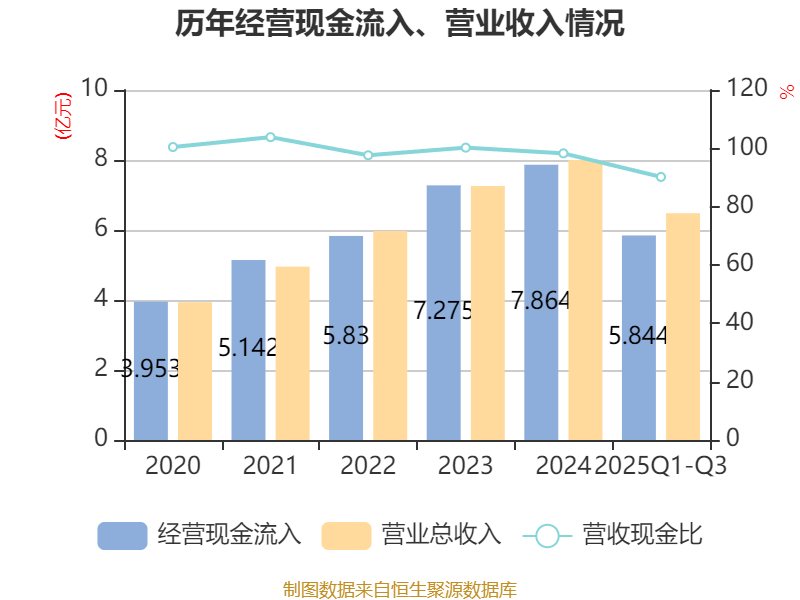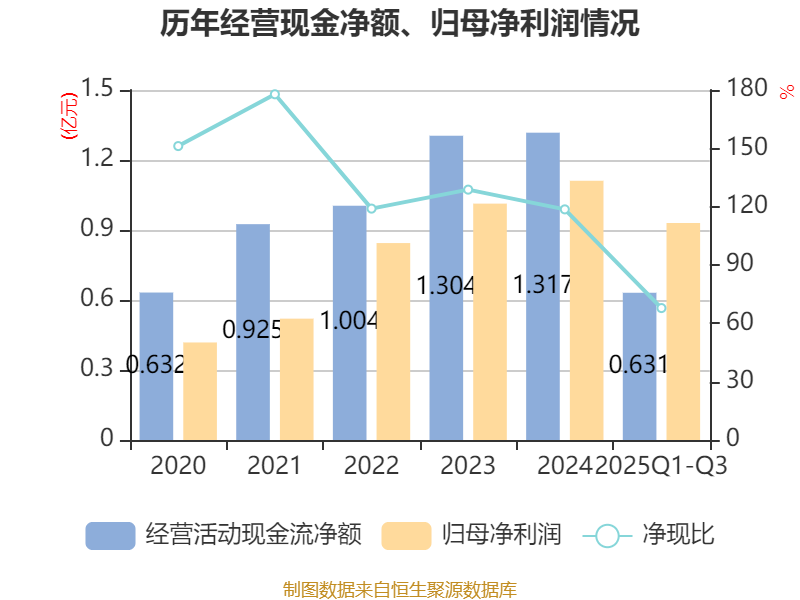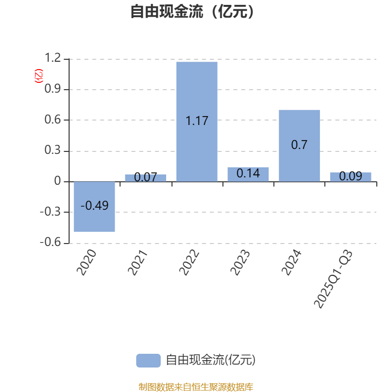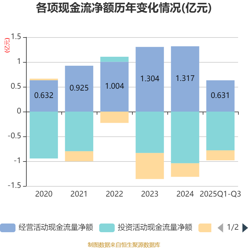 2025年前三季度,公司经营活动现金流净额为6309.08万元,同比增长6%;筹资活动现金流净额-2011.99万元,同比减少34.65万元;投资活动现金流净额-7809.46万元,上年同期为-1.04亿元。