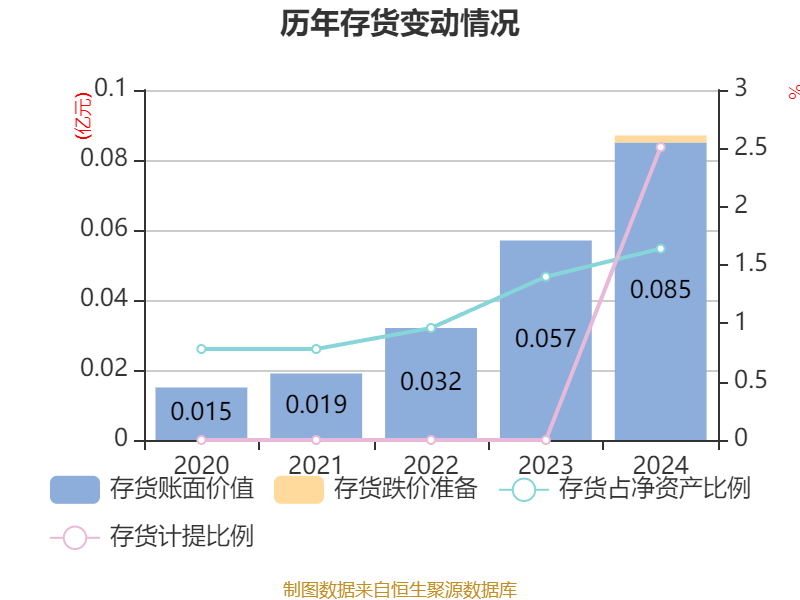 从存货变动来看,截至2024年末,公司存货账面价值为854.34万元,占净资产的1.64%,较上年末增加280.4万元。其中,存货跌价准备为22.02万元,计提比例为2.51%。