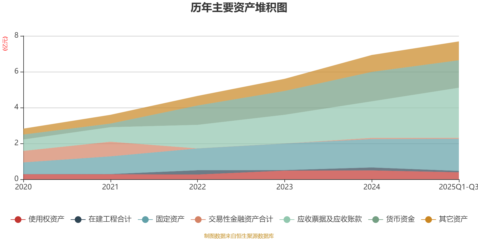 资产重大变化方面,截至2025年三季度末,公司应收票据及应收账款较上年末增加37.01%,占公司总资产比重上升6.91个百分点;货币资金较上年末减少6.58%,占公司总资产比重下降3.75个百分点;使用权资产较上年末减少21.4%,占公司总资产比重下降2.07个百分点;其他非流动资产较上年末增加208.79%,占公司总资产比重上升1.97个百分点。