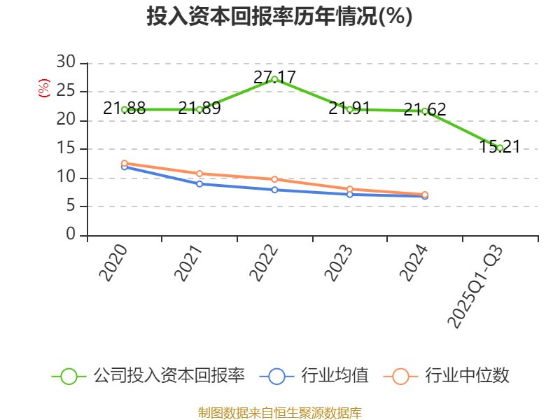 公司2024年投入资本回报率为21.62%,较上年同期下降0.29个百分点。2025年前三季度投入资本回报率为15.21%,较上年同期下降21.26个百分点。