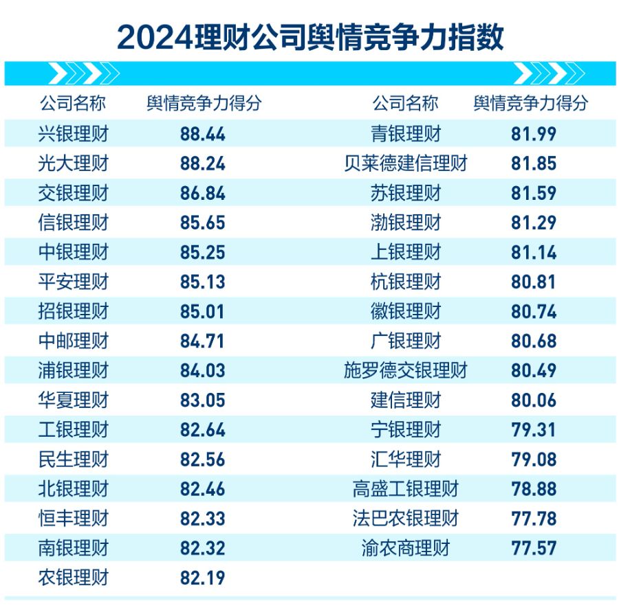 综合来看,2024年共5家银行理财机构在舆情维度总得分低于80分,分数从低到高分别是渝农商理财(77.57分)、法巴农银理财(77.78分)、高盛工银理财(78.88分)、汇华理财(79.08分)和宁银理财(79.31分)。