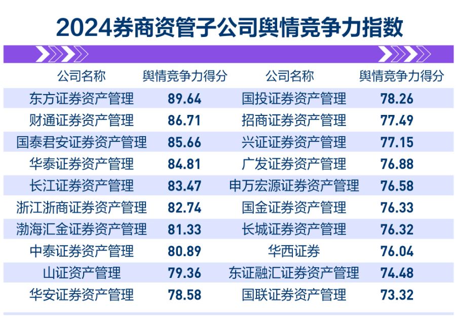 券商资管公司中,在舆情维度总得分低于70分的有4家,分别是国信资管(67.38分)、海通资管(67.94分)、国盛资管(68.28分)和天风资管(69.40分)。