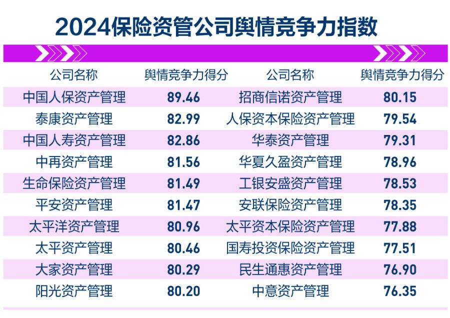 保险资管公司中,2024年共5家机构出现20条以上的负面新闻舆情,包括新华资管、百年保险资管、国华兴益保险资管、国寿投资保险资管、英大保险资管。总得分最高的三家分别为人保资管(89.46分)、泰康资管(82.99分)和人寿资管(82.86分)。