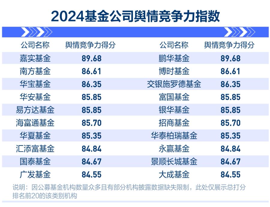 本次对公募基金的舆情评分中,嘉实基金以89.68分位居榜首,南方基金(86.61分)和华宝基金(86.35分)紧随其后。具体来看,公募基金之间的评分差距主要体现在声量得分这一指标上,头部基金机构在舆情总数和发声规模方面体量惊人。相比之下,评分较低的三家机构分别是弘毅远方基金和新疆前海联合基金(均为60.00分),以及瑞达基金(64.02分)。