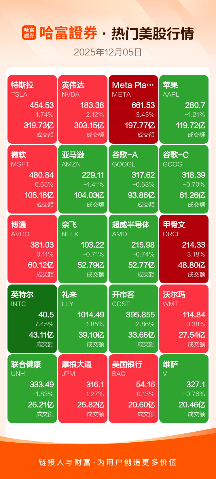 特斯拉涨1.74%,英伟达涨2.12%,Meta Platforms Inc-A涨3.43%,苹果跌1.21%,微软涨0.65%,亚马逊跌1.41%,谷歌-A跌0.63%,谷歌-C跌0.70%,博通涨0.11%,奈飞跌0.71%。