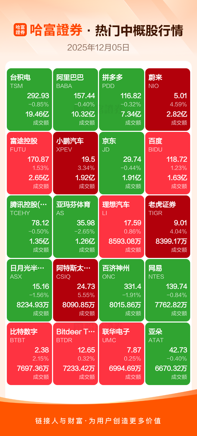 台积电跌0.85%,阿里巴巴跌0.40%,拼多多跌0.32%,蔚来涨4.59%,富途控股涨1.53%,小鹏汽车涨3.34%,京东跌0.44%,百度涨1.23%,腾讯控股(ADR)跌0.50%,亚玛芬体育跌2.65%。