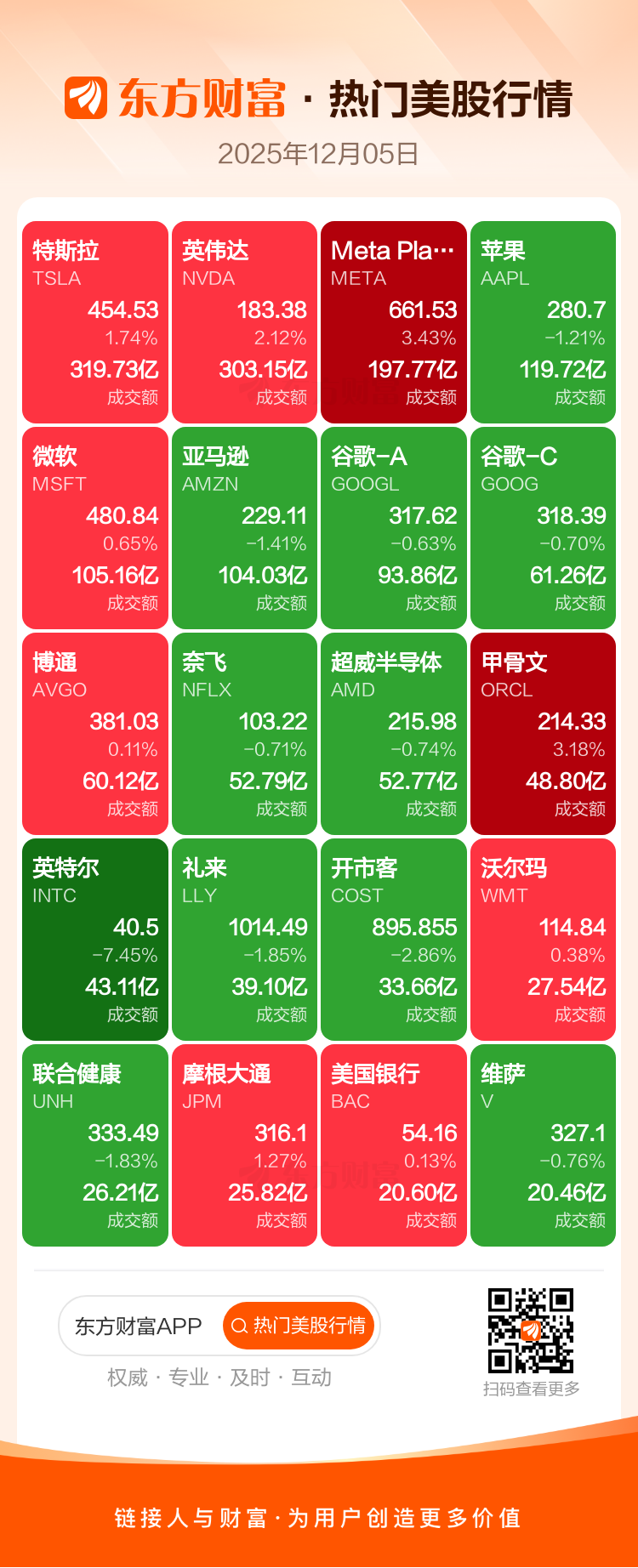 特斯拉涨1.74%,英伟达涨2.12%,Meta Platforms Inc-A涨3.43%,苹果跌1.21%,微软涨0.65%,亚马逊跌1.41%,谷歌-A跌0.63%,谷歌-C跌0.70%,博通涨0.11%,奈飞跌0.71%。