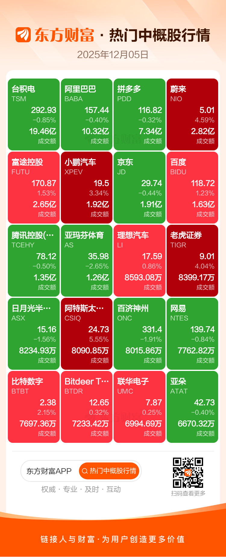 台积电跌0.85%,阿里巴巴跌0.40%,拼多多跌0.32%,蔚来涨4.59%,富途控股涨1.53%,小鹏汽车涨3.34%,京东跌0.44%,百度涨1.23%,腾讯控股(ADR)跌0.50%,亚玛芬体育跌2.65%。